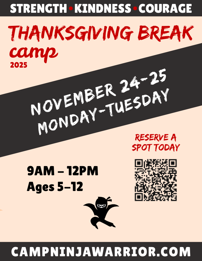 Kick off Thanksgiving Break with an action-packed Thanksgiving Break Ninja Camp! Ninjas will train on obstacles, build strength, and tackle exciting challenges in a screen-free, high-energy, and encouraging environment.